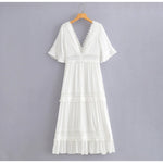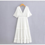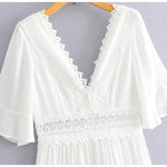 Devenez la reine du soleil avec cette somptueuse robe longue blanche à dentelle et son style vintage. Ses détails, son col en V et ses manches larges vous feront briller aux yeux de tous en vous offrant un look unique. Enfin, sa coupe empire et sa longueur optimale mets en valeur vos courbes féminines. Vous aussi, cette robe vous fait craquer ?