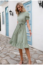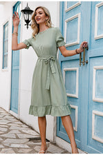 Robe vintage chic avec ceinture en tissu, col rond et imprimé de pois blanc